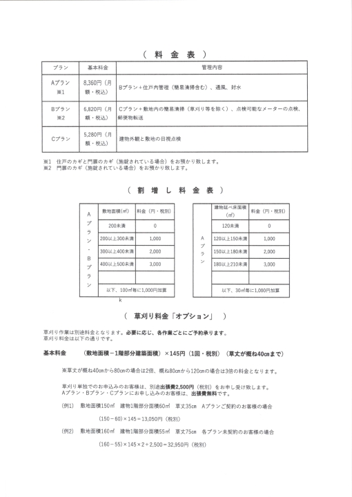 Bプラン 6,820円(月額・税込) Cプラン+敷地の簡易清掃(草刈りはオプションです)、郵便物転送(戸外にポストがある場合)、目視可能なメーターの点検