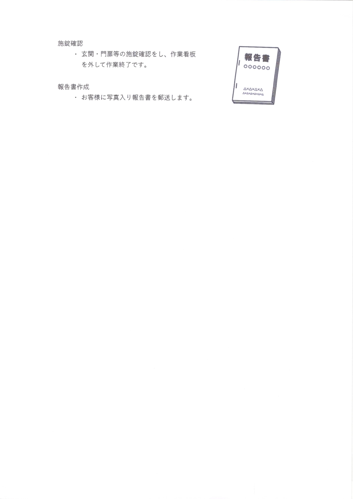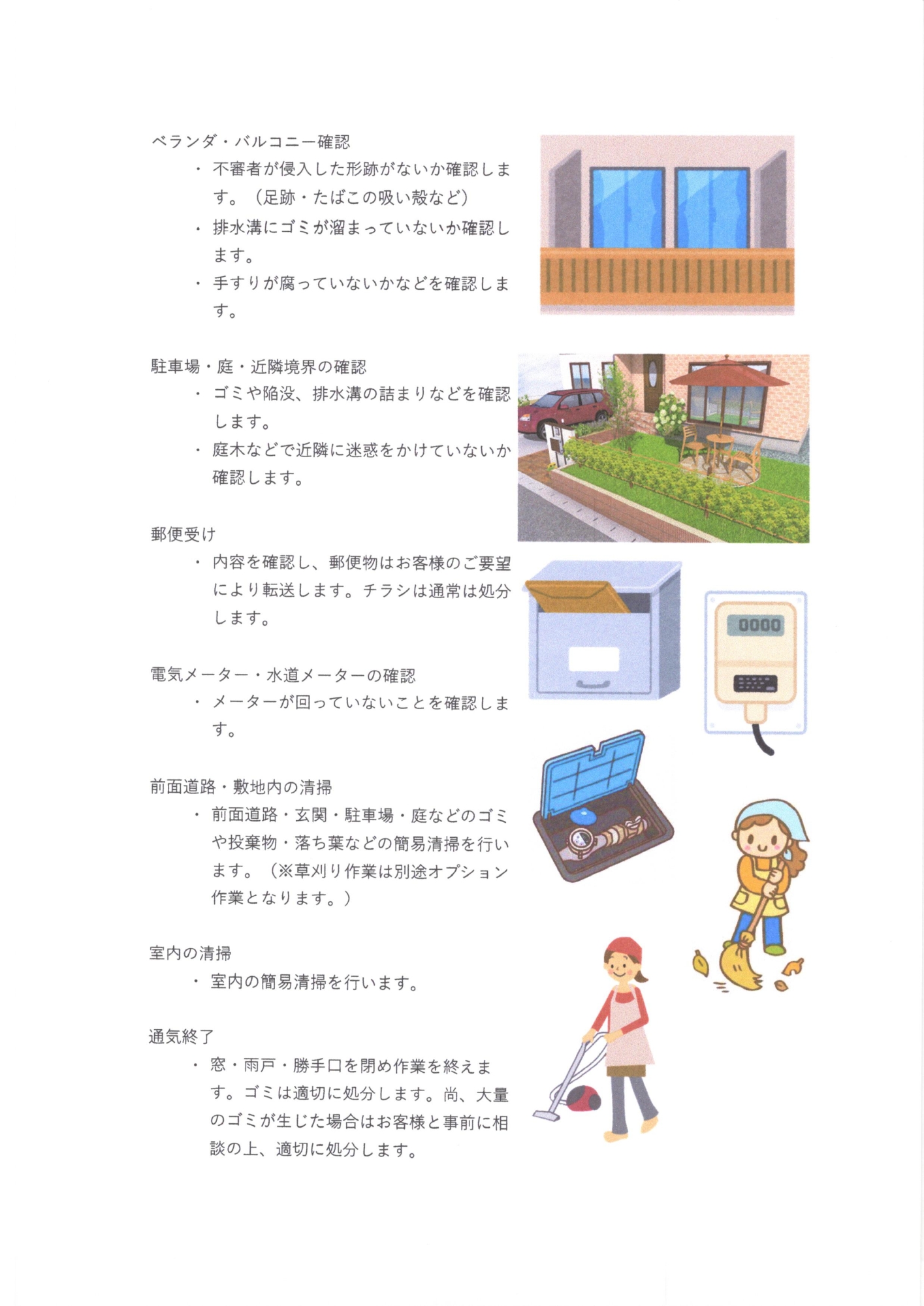 Cプラン+敷地の簡易清掃(草刈りはオプションです)、郵便物転送(戸外にポストがある場合)、目視可能なメーターの点検