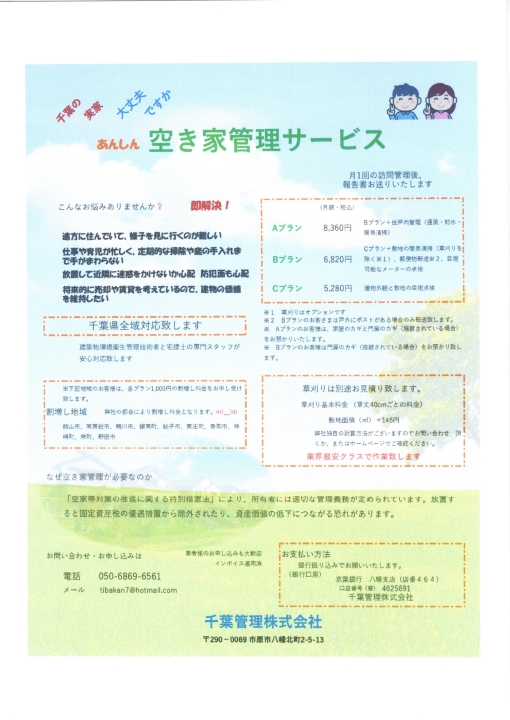Bプラン 6,820円(月額・税込) Cプラン+敷地の簡易清掃(草刈りはオプションです)、郵便物転送(戸外にポストがある場合)、目視可能なメーターの点検